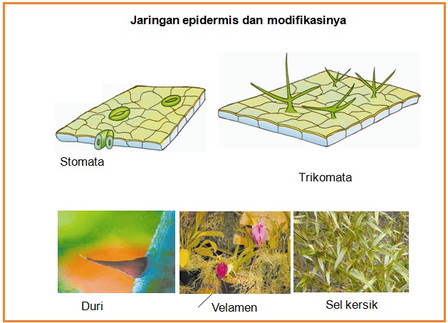 Pada akar dan daun, permukaan epidermis biasanya ditutupi zat kimia (kutikula) yang berfungsi untuk mengurangi penguapan tanaman. Jaringan ini merupakan akar yang di modifikasi epidermis yang berfungsi dalam memperluas penyerapan air dan zat hara dalam tanah. Pada tanaman dikotil, jaringan epidermis daun memiliki dua fungsi utama, yaitu : Terdapat pada tumbuhan dewasa, terletak pada ujung batang dan akar.